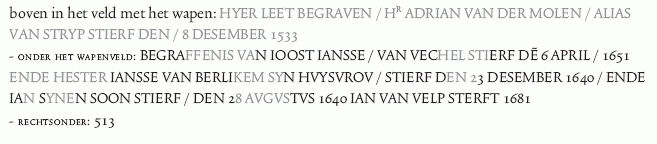klik op de afbeelding om deze te vergroten.De linkerbenedenhoek van de zerk is afgebroken. Verder is de zerk afgesleten met als gevolg dat grote delen van de inscriptie onleesbaar zijn geworden en dat ook de wapens maar gedeeltelijk zijn te ontwaren. De oudste inscriptie, in het wapenveld, is helemaal verdwenen. Om de zerk loopt een smalle rand. Hierbinnen is aan de bovenzijde een grote rechthoek aangebracht met daarbinnen in reliëf een mans- en een vrouwswapen hangend aan een lint, dat om een knoestige tak bovenaan is geslagen. Het lint toont boven de schilden een rozet en loopt eronder uit in kwasten. De twee bovenhoekjes van de rechthoek hebben een driehoekje als versiering, afgescheiden door een golvende rand. De oudste inscriptie en de voorstelling van de wapens lijken elkaar te sparen. De inscriptie in grote gegraveerde kapitalen onder de rechthoek met wapens moet dan later zijn aangebracht. Alliantiewapen (2 schilden, vrouwswapen in ruitvorm): 1 gedeeld; I doorsneden; a drie weefspoelen (?); b drie molenijzers; II een leeuw; 2 een dwarsbalk. Het is de vraag of de wapens betrekking hebben op de tekst uit 1533 of op die uit de jaren 1640-1681. Wat het wapen betreft is er een zekere overeenkomst met zerk 114 [Van der Molen]: doorsneden; I drie inktpotjes met daarin drie naar rechts staande ganzenveren; II een molenijzer. De basisvorm weefspoelen = inktpotjes met ganzenveren is gelijk te noemen. Het verschil tussen één of drie molenijzers is ook niet wezenlijk. Het wapen Van Strijp is een leeuw. 1. Het manswapen betreft dan een alliantiewapen van de ouders van de priester Van der Molen ex matre Van Strijp. Maar wat dan te doen met het ruitvormige wapen? Het kan ook het alliantiewapen Van Vechel-van Berlikem zijn (1640, 1651), maar hoe daarin is een inscriptie uit 1533 te verklaren? Over heer Adriaen van der Molen alias Van Strijp 2.. is nauwelijks iets bekend. Hij wordt in het oudste hertogelijke cijnsboek (circa 1520) vermeld als heer en meester Adrianus van der Moelen en wordt daar aangeslagen voor een perceel van 22,5 voet in de Lange Putstraat. Een relatie met de korenkopersfamilie Van Strijp – een Adriaen van Strijp was in 1478 deken van het korenkopersambacht – kan niet worden aangetoond. 3. Joost Jans van Vechel is een zoon van Jan Joost Lenaerts van Vechel en Christina Wouter Jan Goossens van Uden. Hij woonde in ‘De Hemel’, tegenwoordig Hooge Steenweg 9. Uit zijn huwelijk met Heesken of Hester, dochter van Jan Nicolaes van Berlicum en Maryken de Bye, werd een zoon Jan geboren. De laatste persoon ten slotte die op deze grafzerk wordt vernoemd, Jan van Velp, is een zoon van Dirck van Velp en Margriet, dochter van Joost van Vechel en Anna van Zutphen. Onduidelijk is of Margriets vader dezelfde Joost van Vechel is die hier ligt begraven of dat het om een familielid gaat. Jan van Velp was achtereenvolgens gehuwd met Wilhelmina Willem Danckaerts en Beatrix Bosch. 4. (Oud 448; Nieuw 513; Martini 328; Smits 30) * In 1707 stond het graf op naam van Van Vechel. Blijkens de legger van 1724 werd het vervolgens eigendom van Maria en Hester van Vechel, welke laatste echtgenote was van Cornelis de Leeuw, en voorts van Hester de Leeuw en Johanna van Revesteijn. Nadien worden geen gegevens over het bezit van dit graf meer vermeld. Het was dus tussen 1724 en 1752 in het bezit gekomen van de kerk. De zerk lag in 1821 in de zuidelijke binnenzijbeuk van het schip, de vierde travee vanaf het westen, tussen de derde en vierde arcadepijler. De locatie die de leggers vanaf 1752-1755 geven stemt hiermee overeen. De oudere leggers lijken een afwijkende locatie te geven, namelijk in het middenschip, in de derde of vierde travee vanaf het westen. Toch gaat het hoogstwaarschijnlijk om dezelfde ligging. De zerk lag immers precies op de grens van de zuidelijke binnenzijbeuk en het middenschip. Smits situeerde de zerk in 1912 op vrijwel dezelfde plek als waar deze nu ook nog ligt. | | Berlicum, Heesken ( Hester) van | | | Berlicum, Jan Nicolaes van | | | Bosch, Beatrix | | | Bye, Maryken de | | | Danckaerts, Wilhelmina Willem | | | Leeuw, Cornelis de | | | Leeuw, Hester de | | | Molen alias van Strijp, Adriaen van den 8-12-1533 | | | Revesteijn, Johanna van | | | Uden, Christina Wouter Jan Goossens van | | | Vechel, Hester van | | | Vechel, Jan van | | | Vechel, Joost Jans van | | | Vechel, Joost Lenaerts van | | | | | Vechel, Joost van (x A. van Zutphen) | | | Vechel, Margriet van | | | Vechel, Maria van | | | Velp, Dirck van | | | Velp, Jan van | | | Zutphen, Anna van (x J. van Vechel) | Legenda: begraven in de Sint-Jan vet: hoofdbegravene.