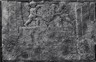 klik op de afbeelding om deze te vergroten.Het betreft het ondergedeelte van een zerk. Van het wapen is het heraldisch rechtergedeelte zover afgesleten dat niet meer is op te maken wat de voorstelling was. De zerk was voorzien van een tekstband met hoekvierpassen met daarin de evangelistensymbolen. Op het middenveld onderaan zien we twee min of meer rechthoekige velden met middenboven twee kleine voluten. Links en rechts bedekken deze velden het ondergedeelte van pilasters. Boven de velden zien we links en rechts twee pilasters op postamenten. Hiertussen zijn twee staande naakte putti te zien, die ieder het wapenschild vasthouden met hun beide handen. De tweede inscriptie is aangebracht, maar dan omgedraaid, op het rechterveld. Alliantiewapen echtpaar (1 schild): Gedeeld; I [vage contouren] [N.N.]; II een uitgerukte boom [Coelen]. Hs 1709, 61.1 geeft het complete wapen en de inscriptie: Alliantiewapen echtpaar (1 schild): Gedeeld; I Samson vechtend met de leeuw, vergezeld boven van een molenijzer; II een uitgerukte dorre boom. Hs 1709, 61.1 bevat de volgende inscriptie: ‘Hier leet begraaven Joris Sampson, sterft 1529 den 16 december en Engelina Coelen, sterft den 26 october 1540, en juffrouw Anna sijn dochter huijsvrouw van Willem Boshuijsen sterft den 4 julij 1544.’ Joris Jans Sampson is in 1481 geboren en werd in 1501/02 poorter van ’s-Hertogenbosch. Van beroep was hij handelaar, waarschijnlijk vooral in graan. Aanvankelijk woonde hij aan de Orthenstraat, vanaf 1504/5 aan de Sadelerstraet, de huidige Schapenmarkt. Joris was zeer welgesteld, in de belastinglijsten van het begin van de zestiende eeuw behoort hij tot de 5% hoogst aangeslagenen. De Illustre Lieve Vrouwe Broederschap van ’s-Hertogenbosch lijkt een bijzondere plaats in zijn hart te hebben ingenomen. In 1502/3 werd hij gewoon lid, in 1505/6 werd hij uitverkoren als gezworen broeder. In 1525/6, 1526/7 en 1531/2 was hij proost van de Broederschap. In 1526 werden tegelijk met Joris’ dochter Anna ook een schoonzuster en zwager, een drietal bedienden van de familie en een inwonende priester lid van de Broederschap. Hij schonk de Broederschap bovendien in 1526 een gouden kazuifel en bestemde in zijn testament maar liefst 100 gulden voor een nieuw orgel. In 1530 wordt Joris vermeld als wasmeester van de Baar der Gelovige Zielen in de Sint-Jan. Op 24 juli 1530 werd hij benoemd tot meester van het Groot Gasthuis. Op 16 mei 1532, om half acht ’s morgens overleed hij plotseling ten gevolge van de pest. Deze sterfdatum wijkt af van de bovengenoemde inscriptieweergave uit Hs 1709, die echter op basis van de bronnen als evident onjuist moet worden beschouwd. Kennelijk was de inscriptie van de zestiende-eeuwse zerk in 1709 al niet goed meer te lezen. Joris was, waarschijnlijk in 1502, getrouwd met Engel, in 1483 geboren als dochter van lakenkoper Peter Colen en Engel Gerits van Merlaer. Zij werd bij haar man in de Sint-Jan begraven. Het echtpaar Sampson liet in 1518 door de populaire Amsterdamse schilder Jacob Cornelisz van Oostsanen een triptiek maken met als onderwerp Maria met kind, waarop zij zelf als schenkers zijn afgebeeld, samen met hun kinderen: Joris wordt vergezeld door een overleden zoon (later bijgeschilderd), Engel door drie overleden dochters en drie nog levende dochters. Op het middenpaneel zien we naast het Jezuskindje waarschijnlijk hun eerstgeboren – 594 – zoontje. De triptiek is waarschijnlijk bedoeld als een smeekbede aan de heilige Anna om een rijk nageslacht. Enige jaren later, rond 1521, werd een zoon Jan geboren, die op jonge leeftijd is gestorven. De oudste dochter Christina werd koorzuster in het Bossche Geertruiklooster en overleed in 1573/4. Dochter Engel, geboren rond 1507, trouwde met schepen Adriaen van Eyndhouts, stierf in 1573 en ligt met haar man elders in de Sint-Jan begraven (zie zerk 354). Dochter Anna ten slotte is rond 1517 geboren, huwde met Willem Willems van Boshuysen en werd na haar dood op 4 juli 1554 – op de zerk zelf staat 1544 – bij haar ouders begraven. Of het triptiek bij het graf in de Sint-Jan heeft gehangen of dat het in de familiekring werd bewaard is onbekend. Via de familie Van Eyndhouts is het schilderij waarschijnlijk op Huis Ter Smissen te Aarle terechtgekomen en zo in handen gekomen van de R.K. parochie van Aarle-Rixtel. 1. (Smits 95-2) * Noch het oude noch het nieuwe registratienummer van de zerk kan worden achterhaald. In ieder geval bevond hij zich vanaf 1912 op de huidige plek. | | Colen, Engel Peters | | · zie ook: 354. Adriaen van Eyndhouts, 1553