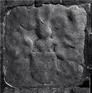BeschrijvingHet betreft een gedeelte van een zerk met een zeer afgesleten wapen. WapensHet niet nader te omschrijven wapenschild hangt aan een lint uit een helm. Helm. Dekkleden. Helmteken: mogelijk twee olifantstrompen. Personen