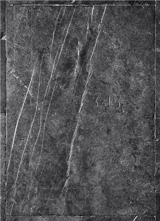 klik op de afbeelding om deze te vergroten.Het betreft het onderstuk van een zerk, waarvan de voorstelling bovendien ernstig is vervaagd. Slechts de vage contouren van wat eens een cirkel is geweest, kan men nog met enige moeite onderscheiden, evenals – linksonder – die van wat een hoekvierpas is geweest. Van de inscriptie zijn nog maar enkele letters te ontcijferen.