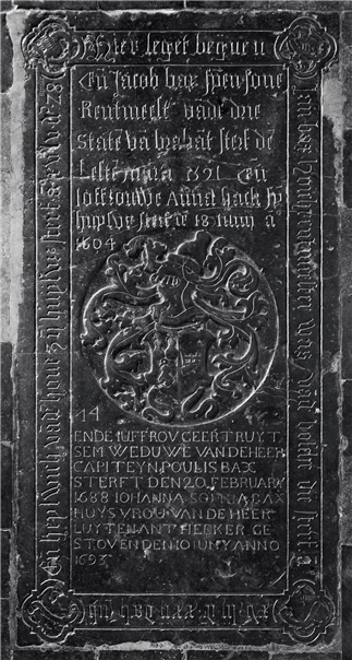 klik op de afbeelding om deze te vergroten.De zerk is in redelijke staat bewaard gebleven. Er is een randtekst die op de hoeken wordt onderbroken door vierpassen met daarin de evangelistensymbolen. In het midden van het middenveld zien we een grote verdiepte cirkel zonder rand met daarin in reliëf het wapen. Alliantiewapen echtpaar (1 schild): Gedeeld; I drie peervormige veldvlessen 1., ook kalebassen genoemd [Bax]; II een omgewende ploeg [Van den Hove]. Het wapen hangend aan een lint uit de helm komend, dat niet zichtbaar is, maar waarvan de uiteinden onder het wapen uitkomen en eindigen in kwasten. Helm. Dekkleden. Wrong. Helmteken: een kalebas. Hs 1709, 104, 1 tekent – opvallenderwijs – twee schilden: Bax = in zwart drie gouden kalebassen, Van de Hove = in goud een zwarte ploeg. Jan Bacx, zoon van Simon Bacx van Herenthals en Alida van Lents, was hoogrentmeester van de domeinen van Brabant in het kwartier van ’s-Hertogenbosch. Hij was gehuwd met Heylwich van den Hove, dochter van Wouter en Johanna Pijnappel. Van de acht kinderen van Jan Bacx en Heylwich van den Hove werd één, hun zoon Jacob, rentmeester-generaal van de Staten van Brabant, bij zijn ouders begraven, samen met zijn vrouw Anna Hack tot Hoogerheide. Hij woonde in het huis ‘De Munt’ in de Postelstraat. Hoewel hij het katholieke geloof trouw bleef, steunden zijn nazaten de zaak van de Opstand, onder hen zijn zonen Paulus, Marcelis en Johan Bacx, allen cavalerie-officier en respectievelijk gouverneur van Bergen op Zoom (Paulus en vervolgens Marcelis) en Heusden (Johan). Een kleinzoon van hun broer Simon Bacx, genaamd Paulus, werd geboren te Deventer in 1621 en huwde in 1647 de uit Breda afkomstige Geertruijd Sem. Hij was eveneens cavalerie-officier en overleed omstreeks 1673. Eerder al had hij het landgoed ‘De Cleijne Strijthoeve’onder Udenhout, dat hij uit de nalatenschap van zijn moeder had verkregen, overgedragen aan zijn dochter Johanna Sophia Bacx. Zijn weduwe werd in 1688 in de familiegrafkelder in de Bossche Sint-Jan bijgezet, evenals – vijf jaar later – haar dochter Johanna Sophia, de echtgenote van de Luthers gezinde Johan Hecker, luitenant van een compagnie ruiters in het regiment van brigadier Schack. 2. (Oud 506; Nieuw 44; Martini 152; Smits 210) * Aan het begin van de achttiende eeuw stond het graf van Jan Bax op naam van ritmr Bax. Tussen 1724 en 1752 kwam het in bezit van de kerk en dit bleef zo tot in de negentiende eeuw. In 1821 lag de zerk in het voormalige Lieve-Vrouwekoor, de huidige Sacramentskapel, op de grens van de eerste en tweede travee vanaf het westen. Uit de leggers blijkt dat het graf zich hier in 1707 al bevond. Uit de verschillende plattegronden van na 1821 blijkt dat de zerk meermaals is verlegd alvorens hij op de huidige locatie terechtkwam. Op de plattegrond van Smits uit 1912 ligt hij in de noordelijke kooromgang, in de eerste straalkapel vanaf het transept, het voormalige Bartholomeuskoor, tegen de oostelijke muur. De plattegrond van 1947 toont hem in de noordelijke buitenzijbeuk van het schip, in de vijfde travee vanaf het westen, tegen de muur tussen de vijfde en zesde muurpijler. Vóór 1978 werd de zerk naar dezelfde plek in de tweede travee vanaf het westen verplaatst, om uiterlijk in 1991 weer teruggelegd te worden in de vijfde travee. Daar ligt hij nu nog steeds. | | Bax van Herenthals, Simon | | | Bax, Jacob | | | Bax, Jan 22-7-1552 | | | Bax, Johan | | | Bax, Johanna Sophia | | | Bax, Marcelis | | | Bax, Paulus | | | Bax, Simon | | | Hack tot Hoogerheide, Anna | | | Hecker, Johan | | | Hove, Heylwich van den | | | Hove, Wouter van den | | | Lents, Alida van | | | Pijnappel, Johanna | | | Sem, Geertruyt | Legenda: begraven in de Sint-Jan vet: hoofdbegravene. klik op de afbeelding om deze te vergroten.
