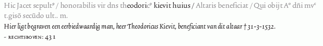 Dirck Kievit, afkomstig uit Asten, was een natuurlijke zoon van de priester Jan Kievit en werd in 1498 gewettigd. Hij was intussen in de voetsporen van zijn vader getreden. Bronnen uit 1478/9 vermelden hem als priester in Oss, in 1485 is hij actief in Kessel. Vanaf 1495/6 wordt hij ook in Den Dungen vermeld, in 1507 is hij in de Dungense kapel bedienaar van het Maria-altaar. Intussen had hij ook het beneficie van het Christophorusaltaar in de Bossche Sint-Jan verworven. In 1510 bediende hij bovendien het altaar van Maria, Catharina, Barbara en Agatha in de Corneliskapel aan de Vughterdijk. Hij was in 1478/9 gewoon lid geworden van de Illustre Lieve Vrouwe Broederschap. Hij bezat goederen en cijnzen in Lithoijen, Kessel, Den Dungen, Boxtel, Vught, Oirschot, Rosmalen en ’s-Hertogenbosch. Heer Dirck werd bij het Christophorusaltaar in de Sint-Jan begraven (zie plattegrond altaren nr. 36). 1.